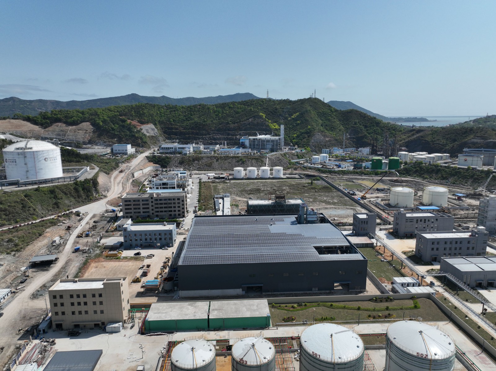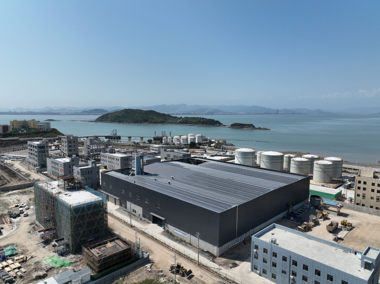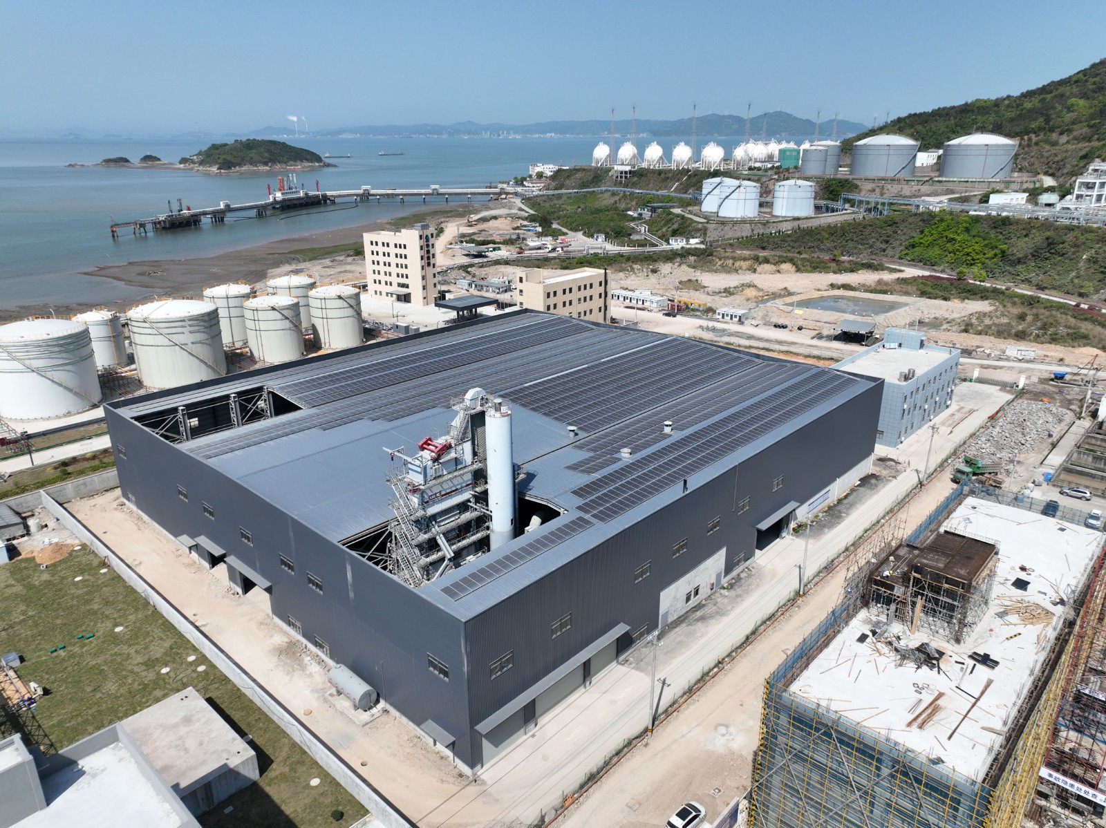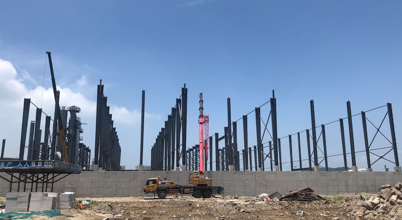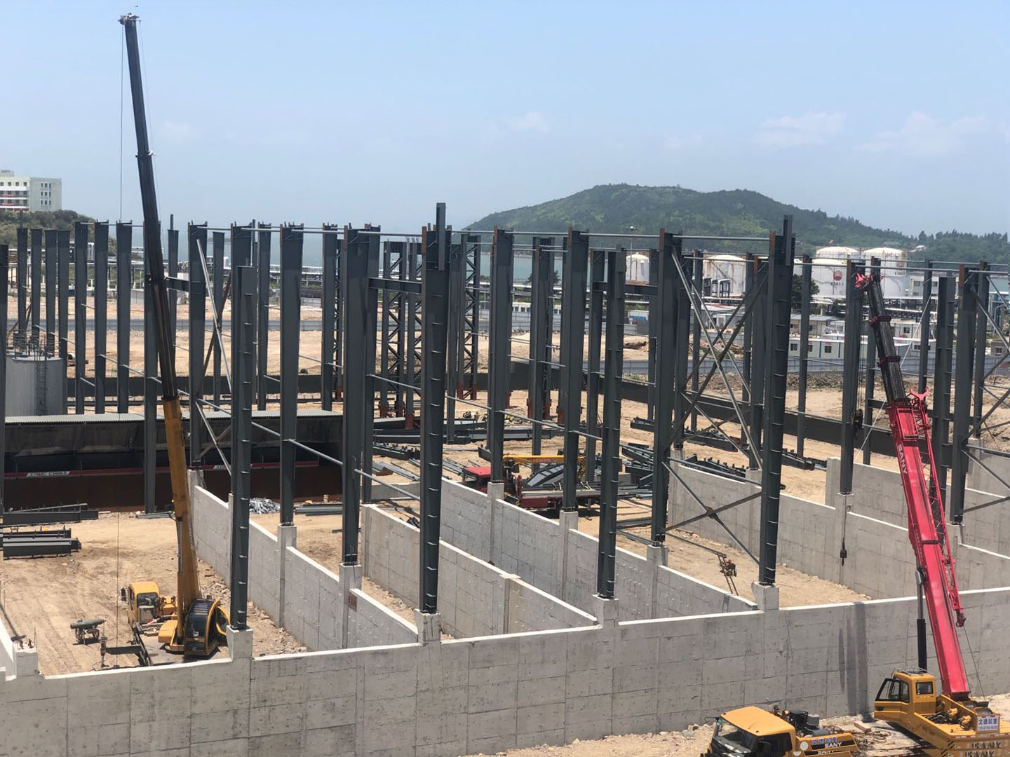 本次施工的浙江开程新材料有限公司年产100万吨封闭式环保型沥青混凝土搅拌站钢结构工程位于温州市洞头区小门岛东屿村B-02AD块。钢结构平面尺寸为97m×87.6m,面积约8500㎡,为单层三连跨结构,跨度分别为A-C轴21.0m、C-F 轴41.8mF-H轴23.18m。该车间的钢柱采用焊接H型钢截面,钢梁采用焊接变截面H型钢截面,钢柱柱顶标高为16m,女儿墙顶标高为17.5m。梁、柱等主要构件(含附属构件)采用Q355B钢,其余次要构件(含附属构件)采用Q235B钢。